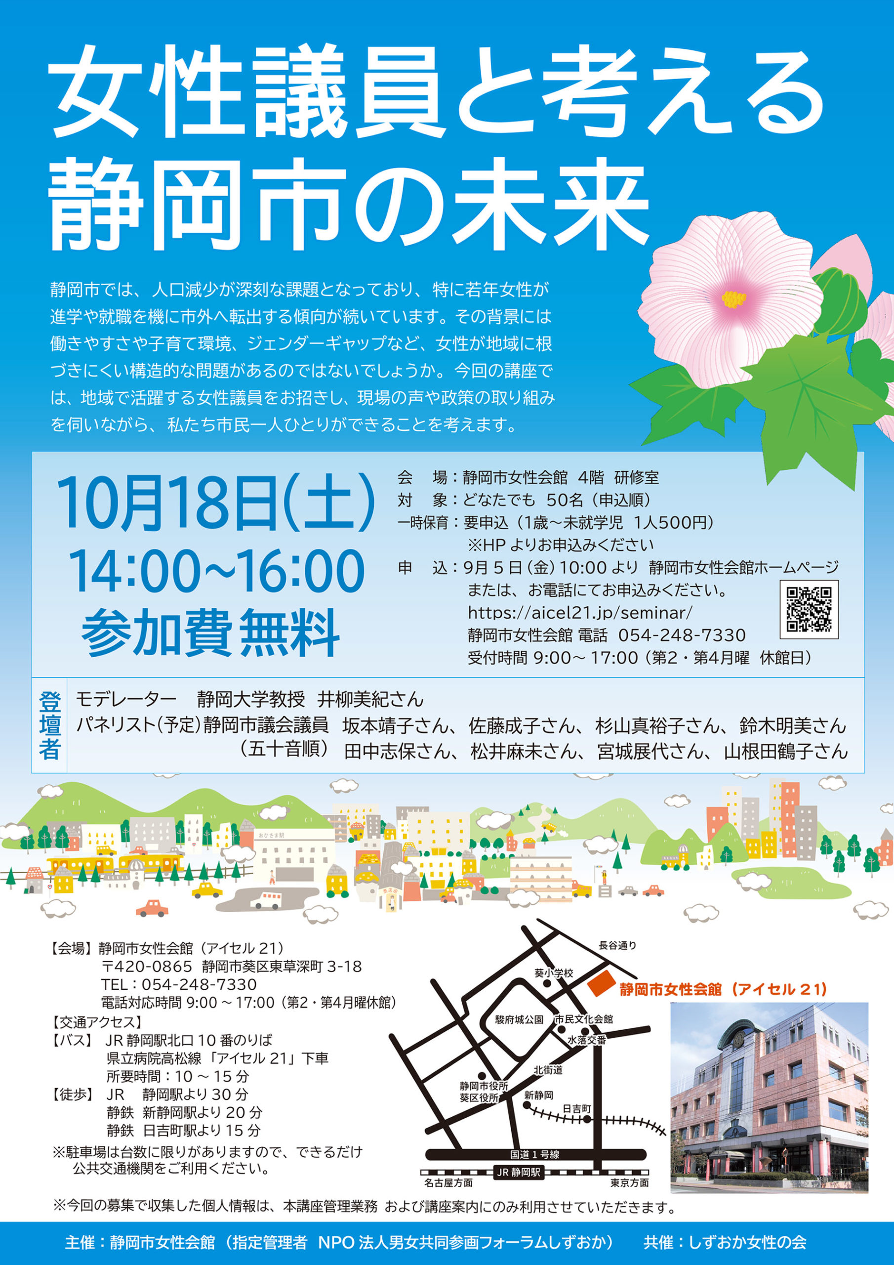 | 備考 | 主催 静岡市女性会館(指定管理者 NPO法人男女共同参画フォーラムしずおか) 共催 しずおか女性の会 |